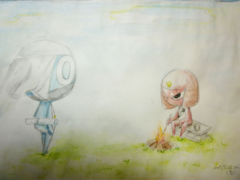 ギロロ君はコーヒー片手に火の具合を調節している。