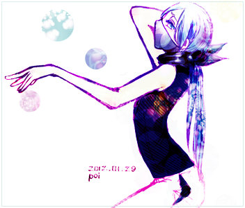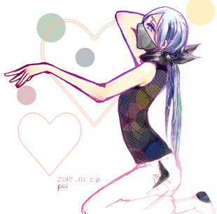 ただでさえ肌や髪が濃い(くどい)塗りになっていたところに、ハートマークなんか散らしたら……なんかすごいことになりました。いやそもそもポーズが疑問ですね。ヘッドホン的な何かを押さえているイメージだったんですが、角度をつけすぎて「あはーん」とでも言い出しそうな……いやそれは自分の頭の中の問題か。でも、線の色を変えられるのはデジタルの強み。灰色くらいまで薄くして、あれを重ねてこれを重ねて、そう考えるとまた楽しいです。